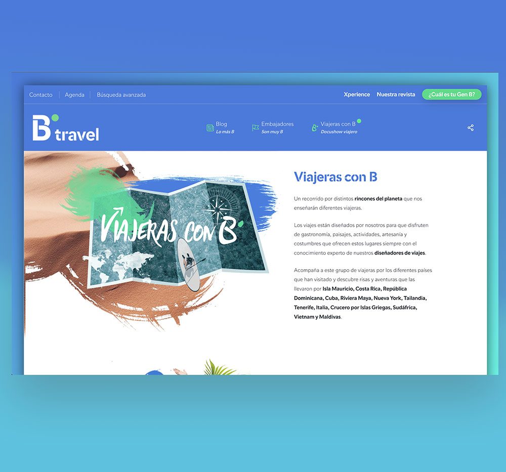 Viajeros con B ha sido desarrollada por el equipo de diseñadores web profesionales de POM Standard y llama la atención del usuario con su equilibrio perfecto entre un diseño limpio y claro, una redacción juvenil y divertida, y una marca muy bien identificada.