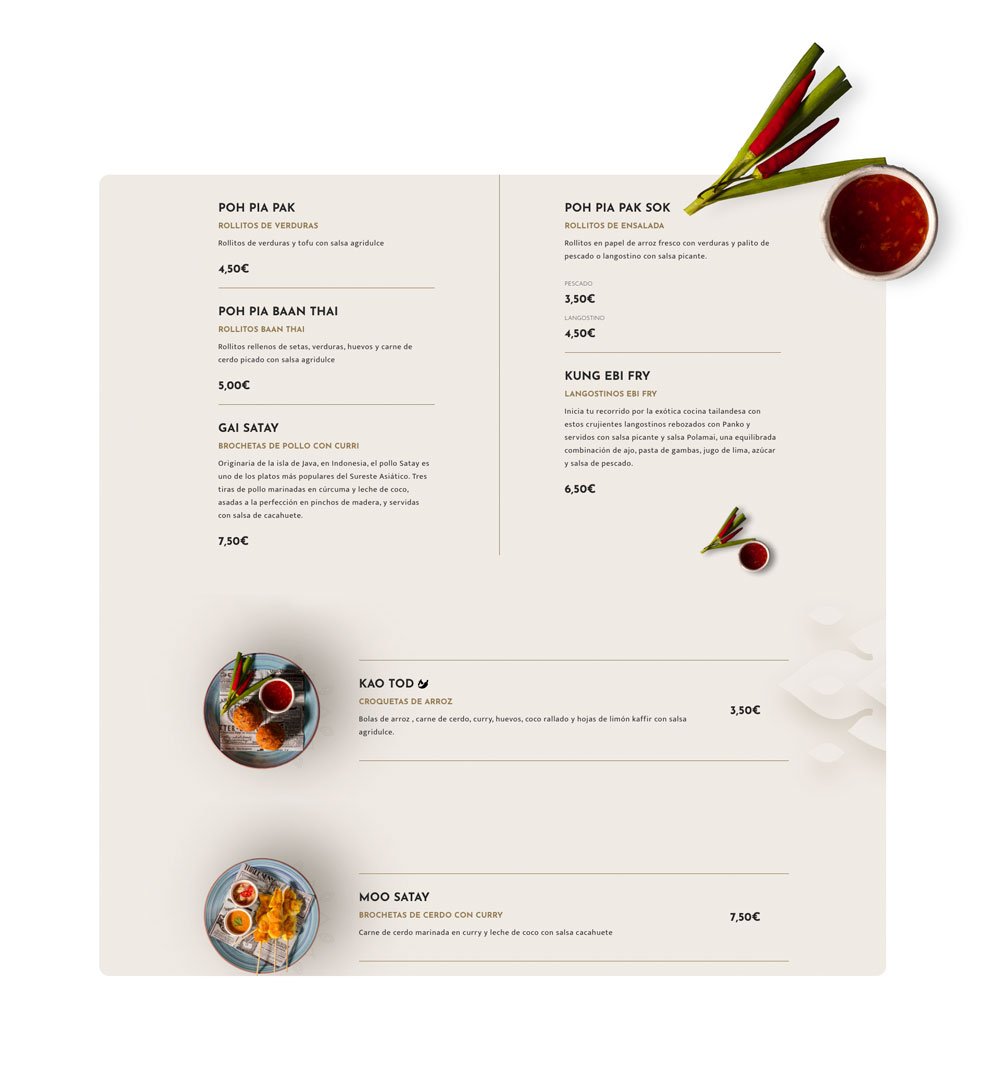 Fíjate cómo lo hemos hecho en la web de Baan Thai: por un lado, hemos introducido los héroes de nuestra cocina en la página de inicio, resaltando su importancia con palabras cautivadoras e imágenes de altísima calidad.